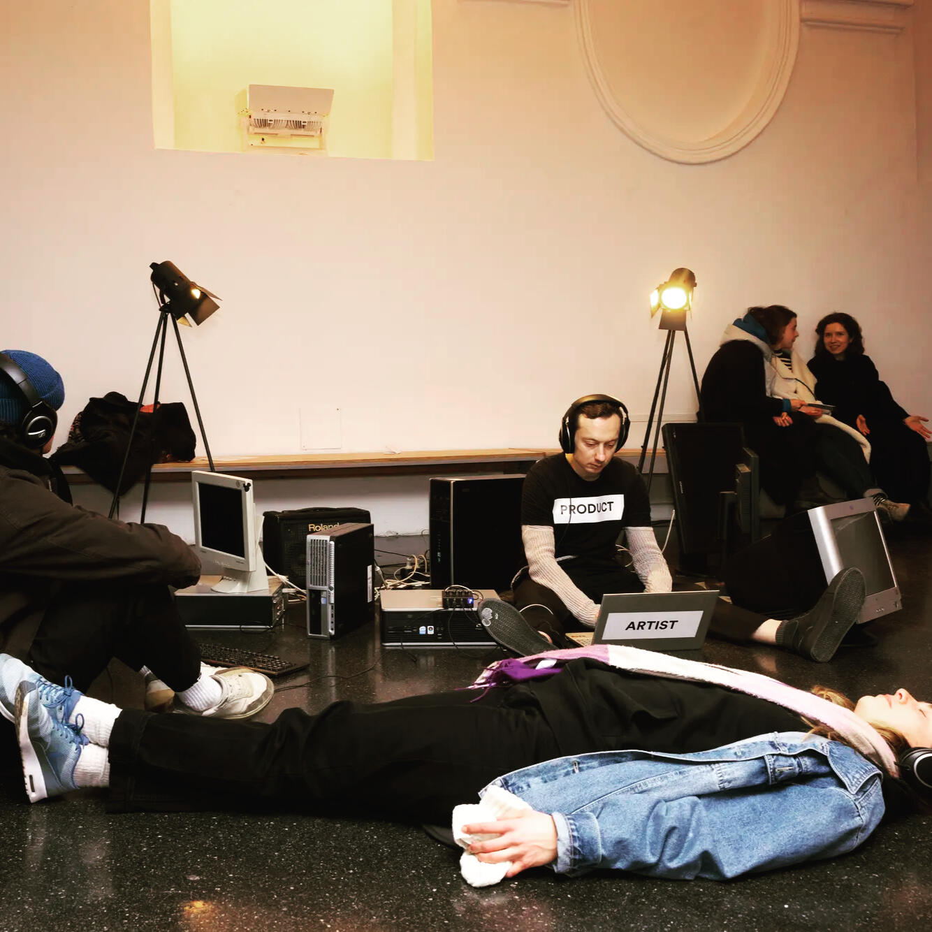 Idle Labor repositions the artist as a functional component within a system of machines. Seated among obsolete computers, Bulat interacts minimally with a laptop labeled “artist”, while his body is marked as “product”, collapsing distinctions between creator, tool, and commodity.The work stages labor without visible output, exposing presence itself as production. Combining performance, installation, sound, and institutional critique, Idle Labor interrogates authorship, digital extraction, and economies of visibility in contemporary artistic practice. Premiered at MuseumsQuartier (Vienna), the piece has been developed for experimental performance spaces, conceptual exhibitions, and curatorial programs exploring durational and site-responsive art.